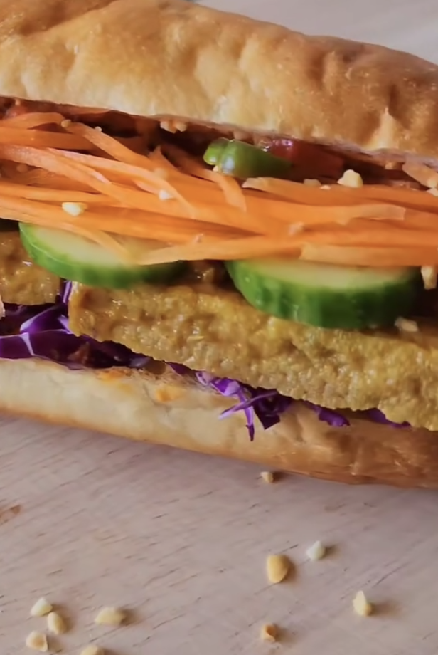 Warm and flavourful satay-marinated tofu, crisp veggies and a gingery peanut sauce are stuffed into a warm, fluffy baguette.